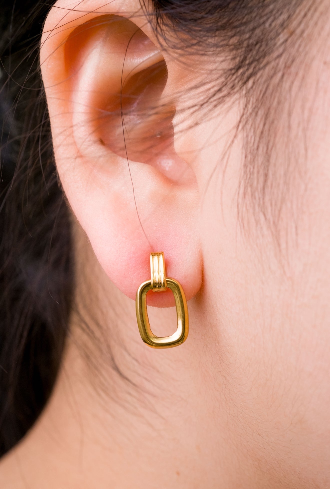 Petite open square studs suspended from a ridged bar. Waterproof, tarnish free, and hypoallergenic for minimal architectural chic.