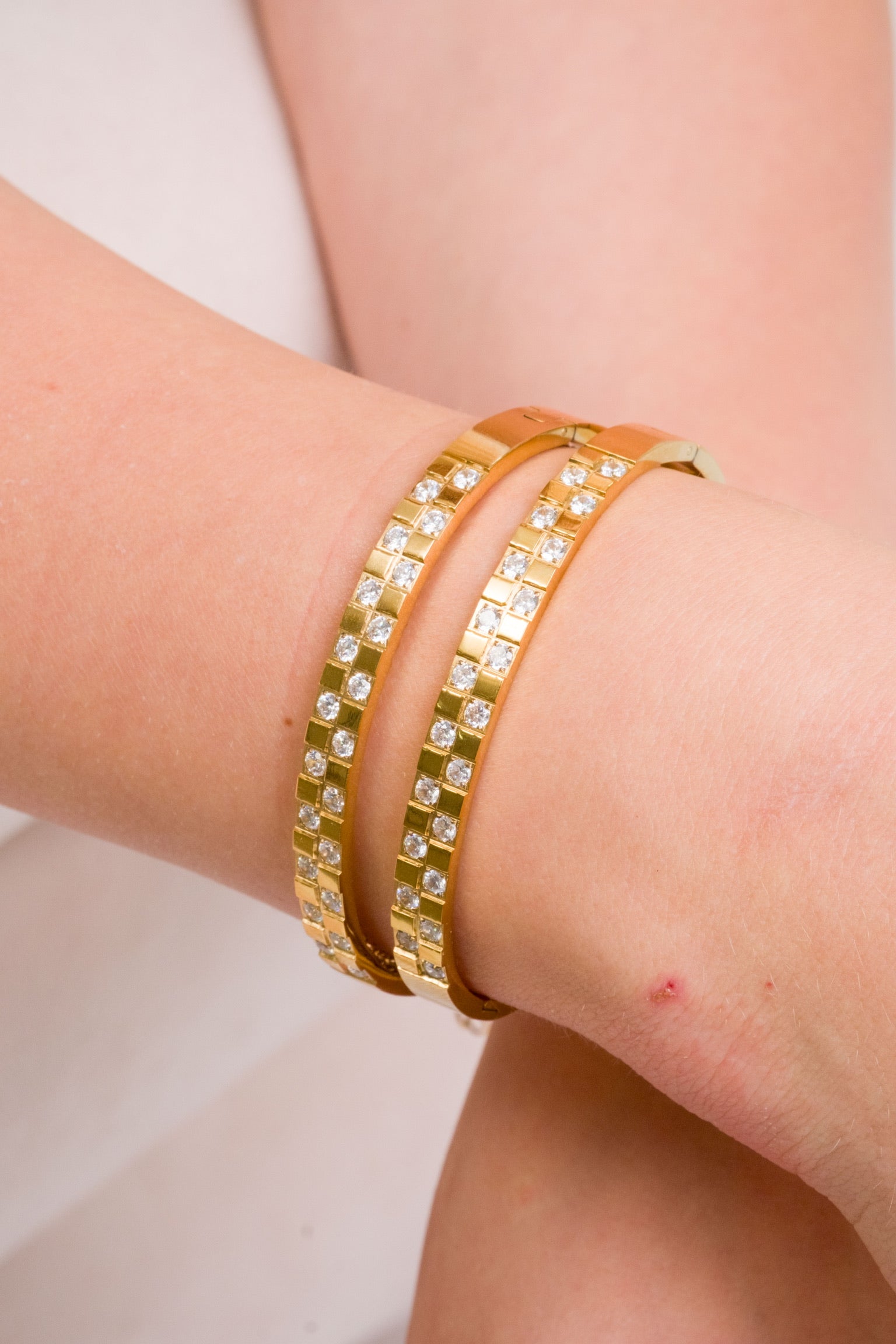 Gold with crystal-cut squares catching soft reflections. The Aura Tile Bracelet is waterproof, tarnish-free and hypoallergenic, hypnotic mirrored radiance.