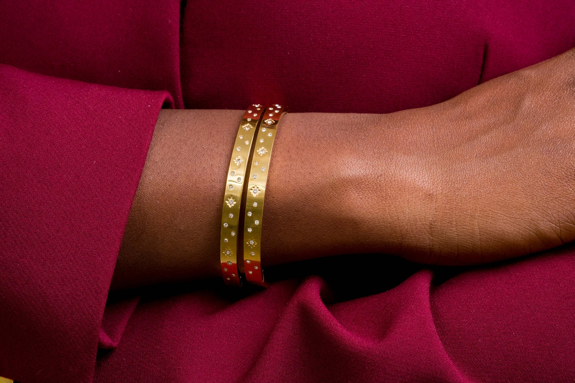 Mirror-polished gold dusted with delicate starbursts. The Gloria Night Bracelet is waterproof, tarnish-free and hypoallergenic, magical whispers of light.