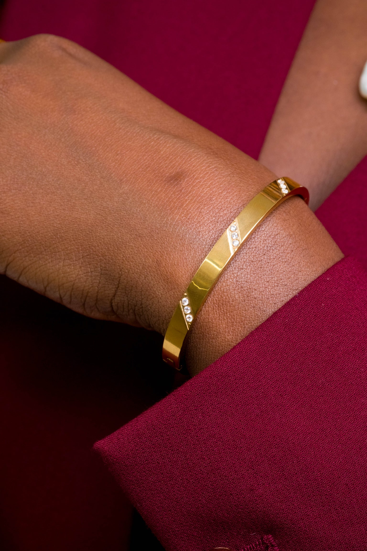 Matte gold with subtle crystal triangles. The Matte North Star Bracelet is waterproof, tarnish-free and hypoallergenic, quiet guidance and serenity.