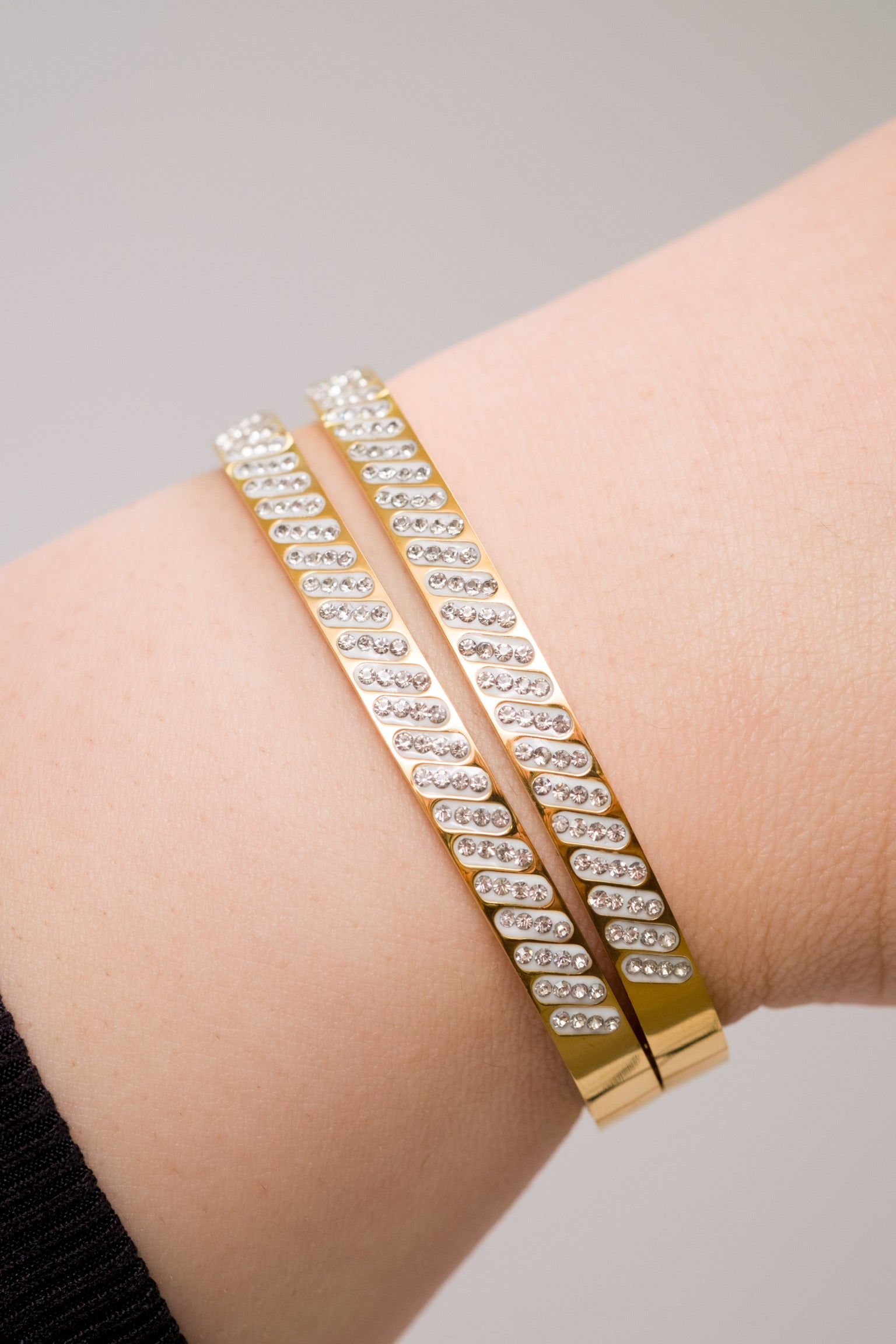 A diagonal pavé row spiralling the wrist. The Marsha Bracelet is waterproof, tarnish-free and hypoallergenic, edgy sophistication in motion.