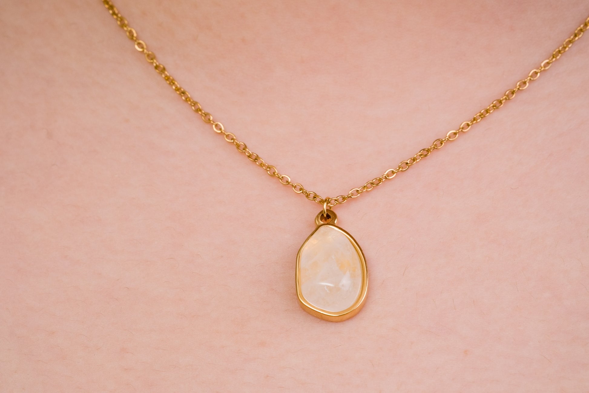 An iridescent opal framed in gold, glowing with soft colour. Waterproof, tarnish-free, and hypoallergenic.