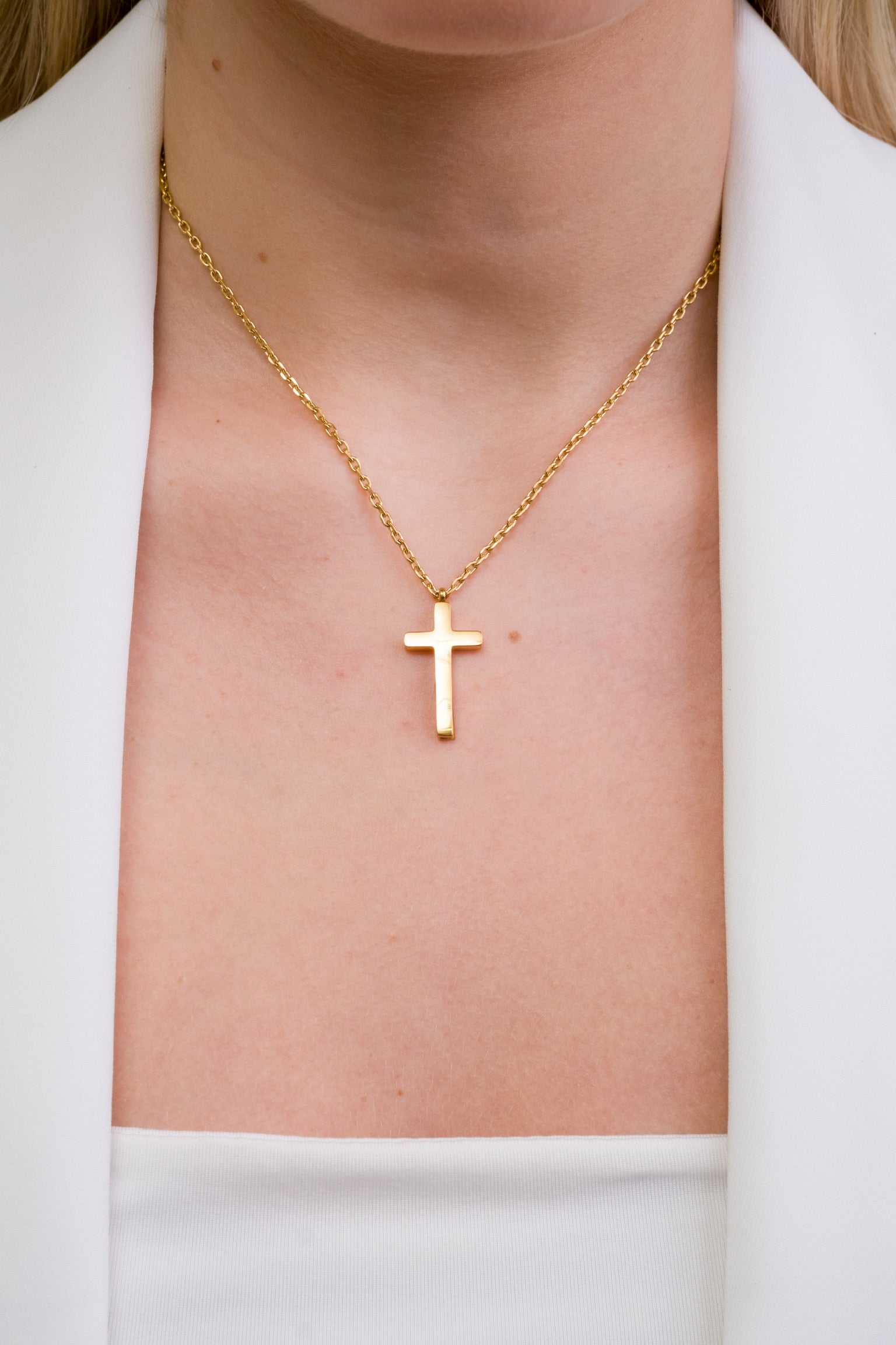 A polished minimalist cross for timeless everyday wear. Waterproof, tarnish-free, and hypoallergenic.