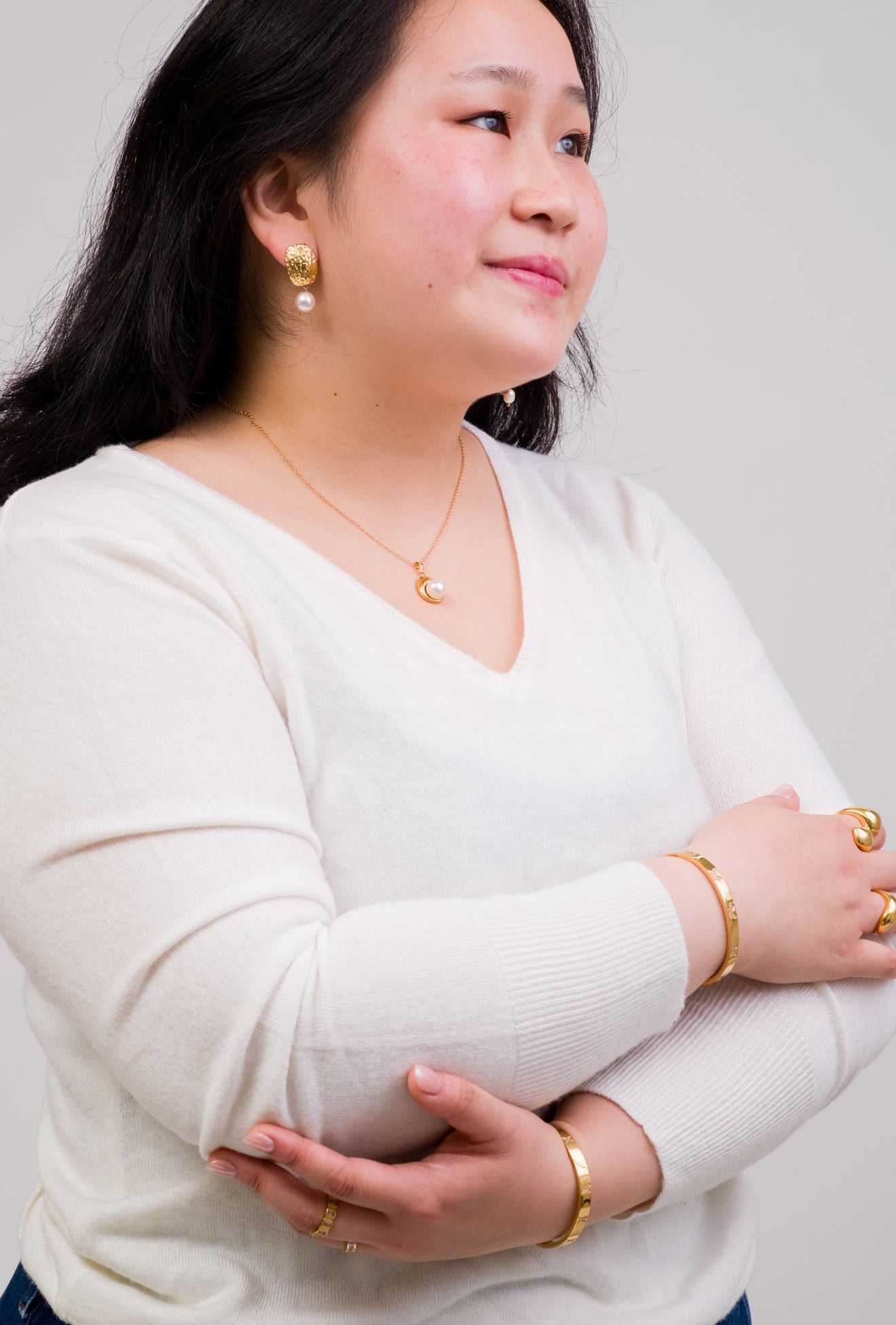 Molten gold discs paired with soft white pearls. Waterproof, tarnish free, and hypoallergenic, blending modern texture with classic grace.